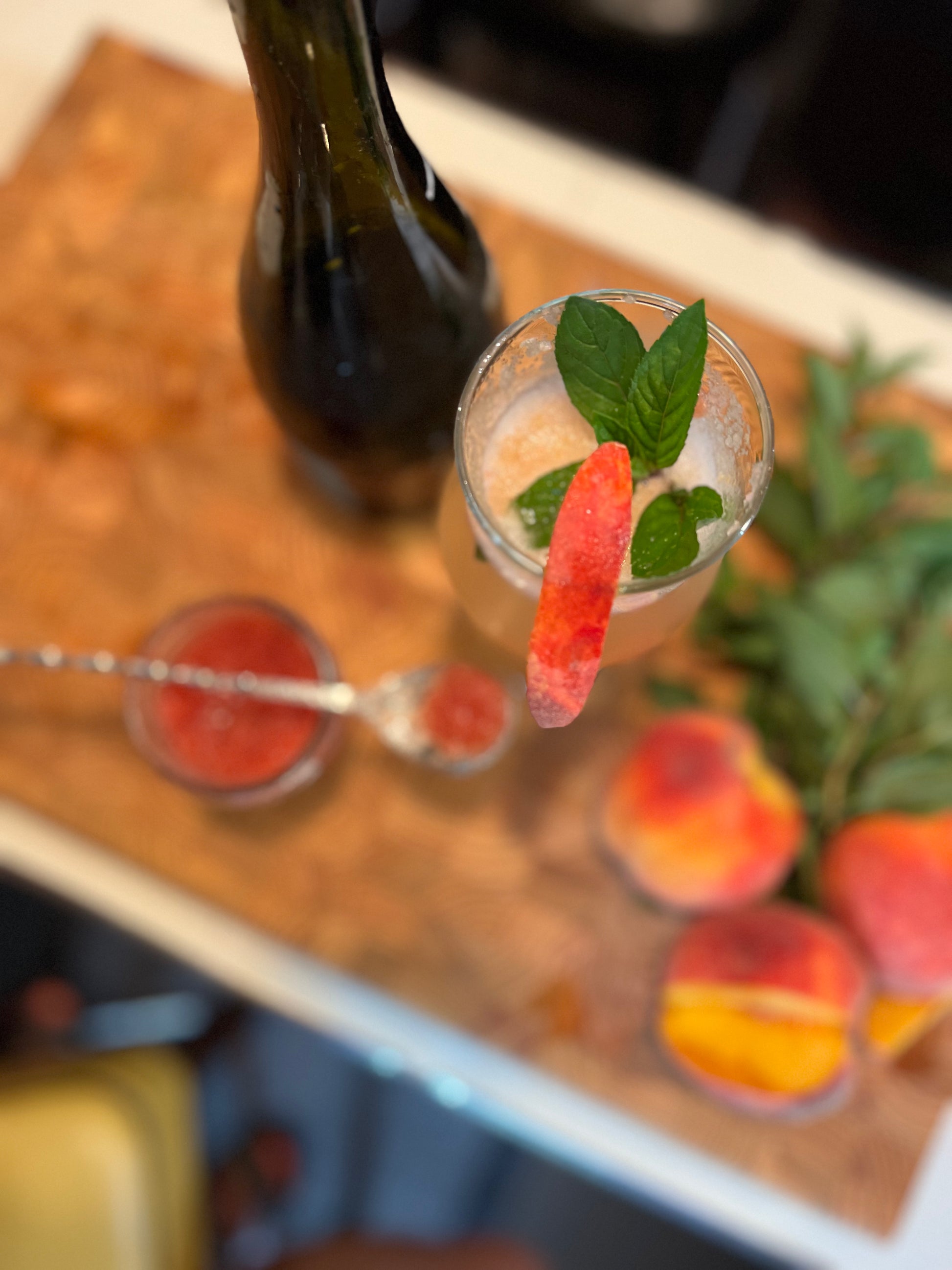 We usually make a chunky peach jam, but we decided to keep the skins on while simmering these peaches to make a jewel-toned, smooth preserve and we're calling it "Birdie's Bellini Peach Jam" (champagne not included).